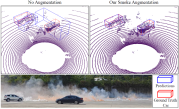 简介: 在烟雾等恶劣天气下,激光雷达点云往往稀疏且噪声显著,导致三维目标检测性能严重下降。为此,本文提出了一种基于物理原理的烟雾仿真框架,用于合成高保真烟雾点云并增强模型感知鲁棒性。首先,构建了基于三维流体动力学的烟雾仿真系统,模拟烟雾粒子的空间扩散与时间演化;结合物理精确的激光雷达感知模块,捕捉光束衰减、散射与多路径效应等复杂光学交互,生成高保真、物理一致的烟雾点云。其次,使用基于距离图像的数据融合策略将仿真烟雾点云集成至真实LiDAR数据集,准确模拟LiDAR扫描特性并自然引入遮挡效应。此外,构建了真实场景LiDAR烟雾数据集LiSmoke用于方法性能验证。结果表明,使用本方法合成数据训练的模型在烟雾场景中检测性能显著提升。