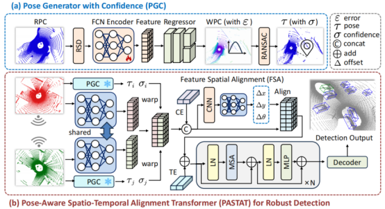 简介: 多智能体依赖于精确的姿态信息共享和对齐观测数据,以实现对环境的协同感知。然而,现有定位方法在GNSS信号受限环境下容易失效,导致难以实现一致的感知特征对齐。为此,本文提出一种基于激光雷达定位的无GNSS协同目标感知框架。首先提出了轻量级的置信度姿态生成器估计紧凑的姿态和置信度表示,其次设计了姿态感知时空对齐变换器,在捕获关键时间上下文的同时,执行置信度感知的空间对齐。此外,提出一个新的仿真数据集V2VLoc,用于验证定位和协同检测任务。在 V2VLoc和V2V4Real 数据集上的实验验证了本方法的有效性和泛化能力。