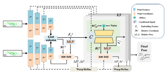 简介: 基于学习的激光雷达里程计方法通过端到端回归相对位姿展现了优越性能,然而当迁移到新场景时性能显著降低。为此,本文提出一种简洁而高效的激光雷达里程计框架RCP-LO。首先,创新性地将相对位姿表示为相对坐标并基于几何验证进行求解,避免了过度简化的位姿表示。其次,为捕捉动态环境中遮挡点云相对位姿估计固有的不确定性,引入去噪扩散模型进行相对坐标采样,在增强鲁棒性的同时生成合理位姿假设。还设计了可微分加权奇异值分解模块,通过单次前向传播即可实现高效位姿估计。实验表明,仅在KITTI数据集上进行训练,在KITTI-360、Ford和Oxford数据集上均达到与当前最优学习方法相当的精度。
