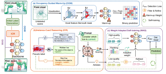 简介: 无监督三维目标检测通过启发式算法发现潜在目标,为自动驾驶降低标注成本提供了有效途径。现有方法主要通过生成伪标签并进行自训练迭代来优化模型,但这些伪标签在训练初期往往存在错误。为此,本文提出基于占用引导预热和大模型先验推理的无监督目标检测方法OWL。首先采用占用引导的自监督预热策略学习场景特征,有效缓解错误伪标签对网络收敛的干扰;其次引入实例线索推理模块,利用大模型先验知识评估与优化伪标签质量;最后设计自适应权重自训练策略提升模型性能。在Waymo和 KITTI 数据集上的实验表明OWL显著优于SOTA无监督方法。