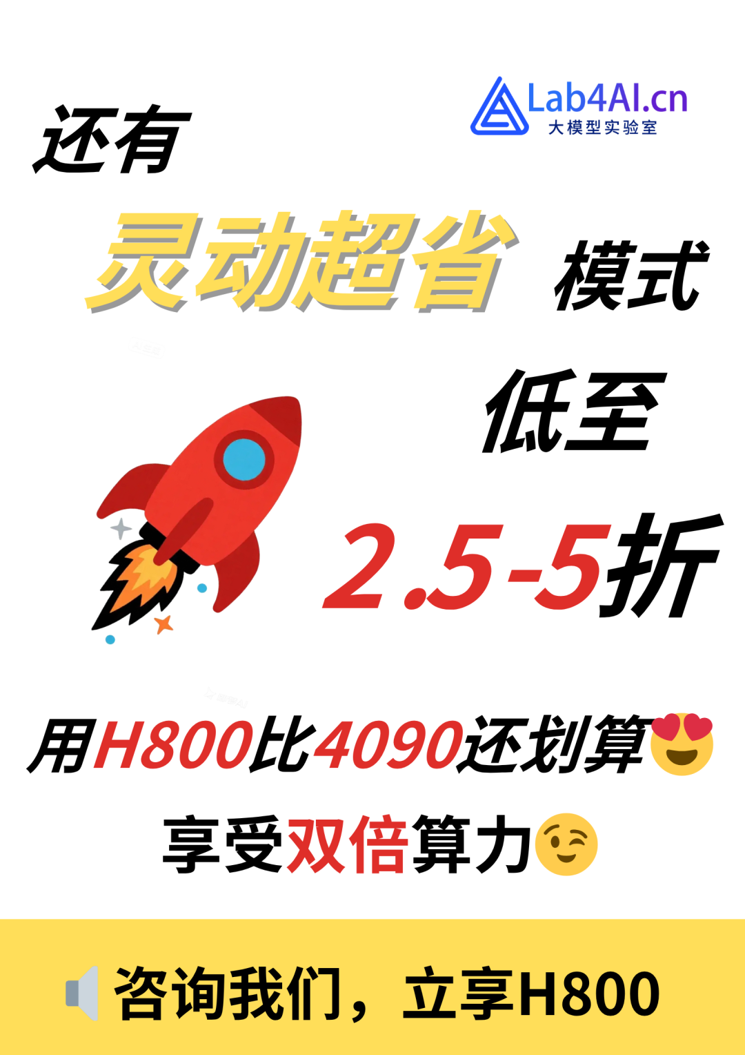 大模型实验室Lab4AI实现算力与实践场景无缝衔接,支持模型复现、训练、推理全流程使用,且具备灵活弹性、按需计费、低价高效的特点,解决用户缺高端算力、算力成本高的核心痛点。