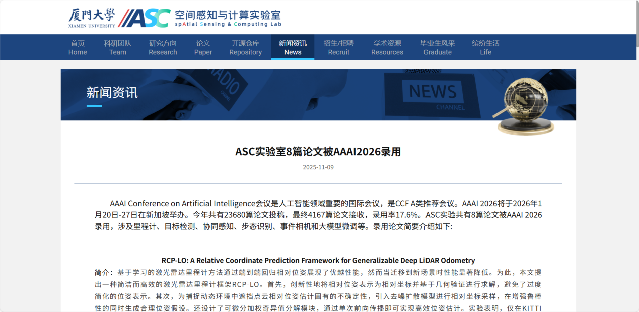 AAAI Conference on Artificial Intelligence会议是人工智能领域重要的国际会议,是CCF A类推荐会议。AAAI 2026将于2026年1月20日-27日在新加坡举办。今年共有23680篇论文投稿,最终4167篇论文接收,录用率17.6%。ASC实验室共有8篇论文被AAAI 2026录用,涉及里程计、目标检测、协同感知、步态识别、事件相机和大模型微调等。