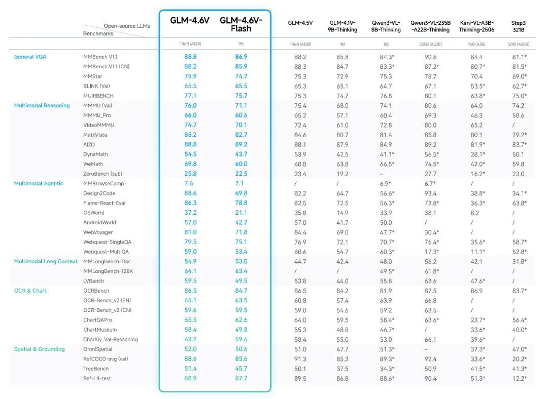 在MMBench、MathVista、OCRBench等30多个主流多模态评测基准中,GLM-4.6V均表现出色。9B版本的GLM-4.6V-Flash整体表现超过Qwen3-VL-8B,106B参数版本的性能比肩2倍参数量的Qwen3-VL-235B。