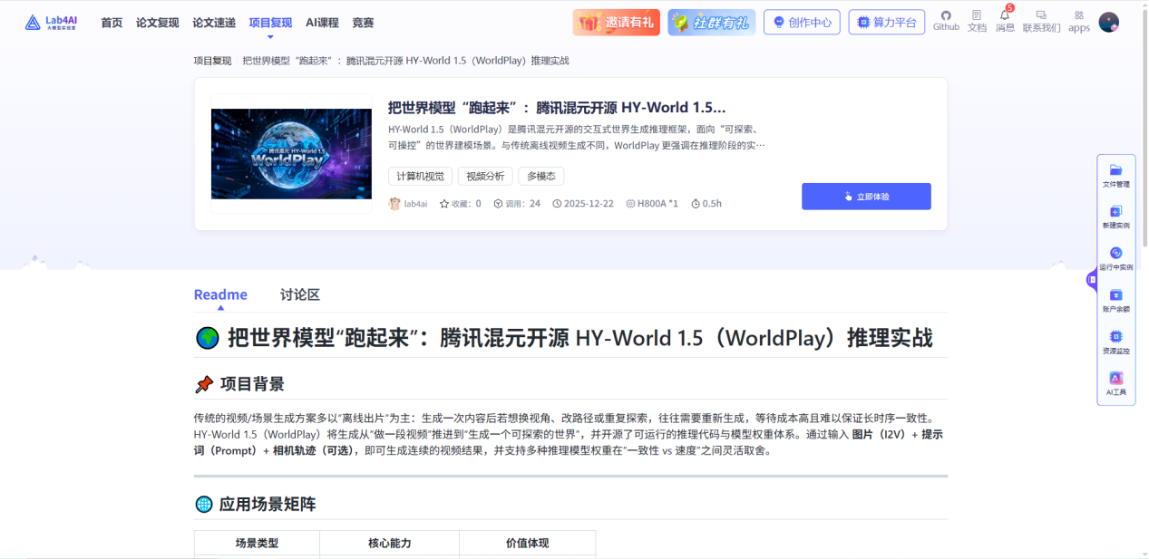 在 Lab4AI 平台上,搜索腾讯混元世界模型 1.5,即可找到项目。