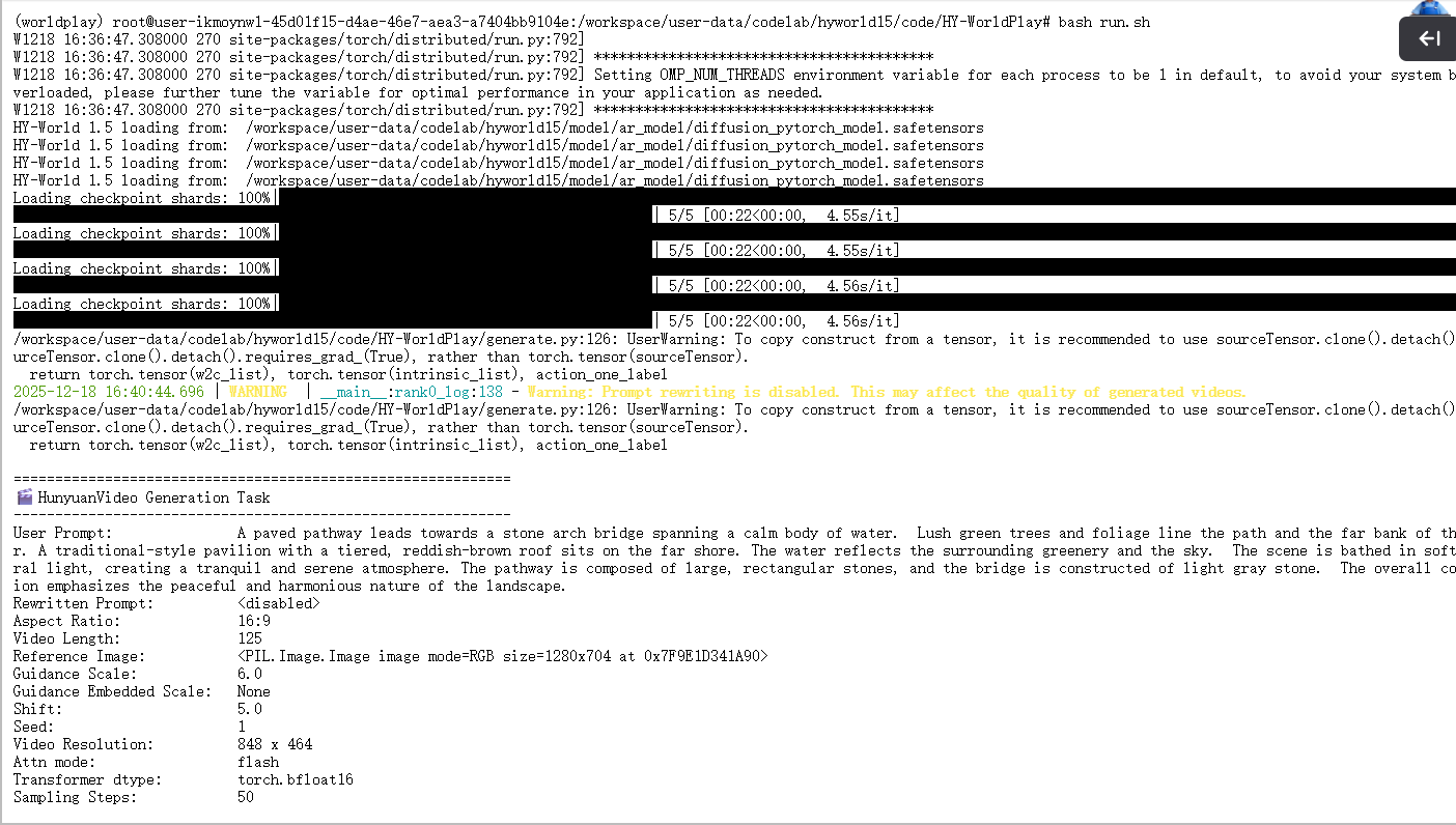 所有模型已经部署完成,运行 bash run.sh 后,即可开始体验 HY-World 1.5 的强大推理能力,快速生成虚拟世界的视频内容。
