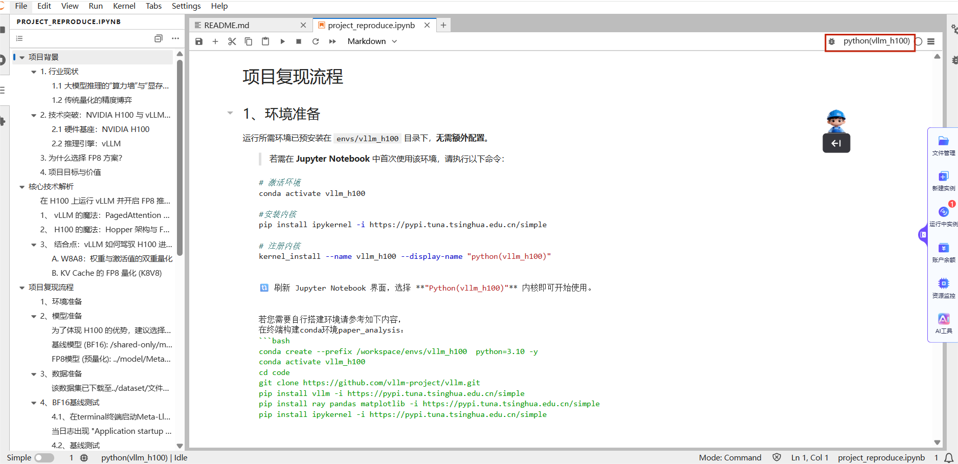 打开 project_reproduce.ipynb,在项目复现流程”部分运行部分代码并切换到已配置好的环境内核(按 Notebook 提示完成即可)。