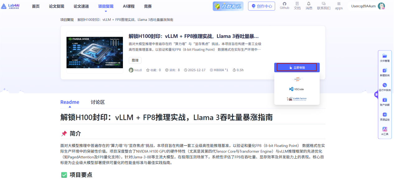 在 Lab4AI 平台中搜索或点击对应项目解锁 H100 封印,点击立即体验,只需 1 卡即可体验。