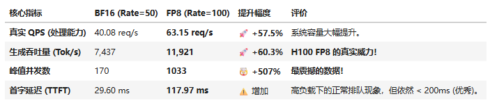 BF16 输出吞吐约 7.4k tok/s,切到 FP8 后提升到 ~11.9k tok/s,吞吐直接拉升一档,说明 H100 的 FP8 计算路径确实能把算力吃满。