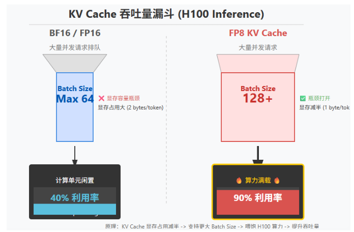 FP8 KV Cache:瓶口变宽(容量减半),并发达到 128+,计算单元利用率飙升至 90%,触发 H100 的“狂暴模式”。