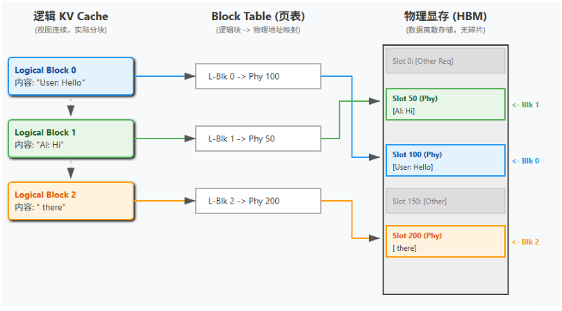 vLLM 的 PagedAttention 用虚拟内存和分页思想管理 KV Cache:把每个请求的 KV 拆成固定大小的 KV Blocks,并通过 Block Table 记录“逻辑连续的 token 块”到“物理显存块”的映射关系,使 KV Cache 可以按需分配、物理不连续存放,从而显著降低碎片化与无效占用,为高并发场景腾出显存空间。