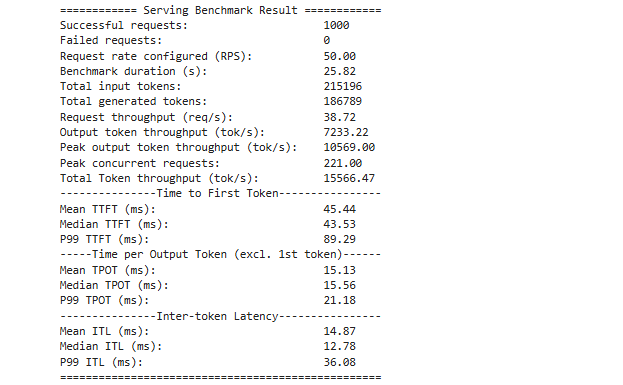 TPOT 上升到 38.75 ms/token,换算约 25 token/s。即便在千级并发的极限压力下,输出仍然是连续可读的,体验仍处在可用区间。