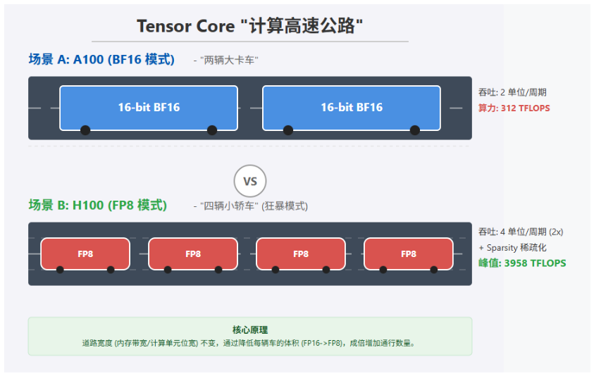 在内存带宽、算力单元等硬件条件不变的情况下,通过采用更窄的浮点精度(从 BF16 降到 FP8)+ 稀疏化技术,让数据能更密集地 “运输”,从而大幅提升 Tensor Core 的计算效率。