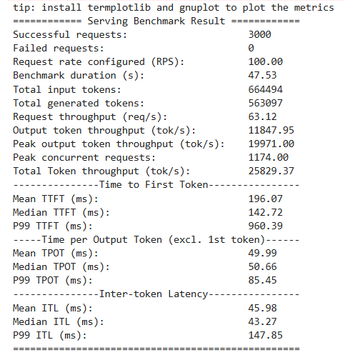 设定到达速率 100 RPS,实际完成吞吐稳定在 ~63.15 req/s。这基本就是 Llama-3-8B 在该数据分布下单张 H100 的可持续服务极限,再加压只会排队更长。