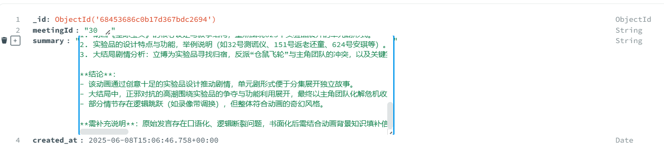 updateSessionMessages里只靠m.content.includes('会议总结')来判断,但实际返回的纯文本 summary 并不包含该关键词,导致根本不同步到后端。 -