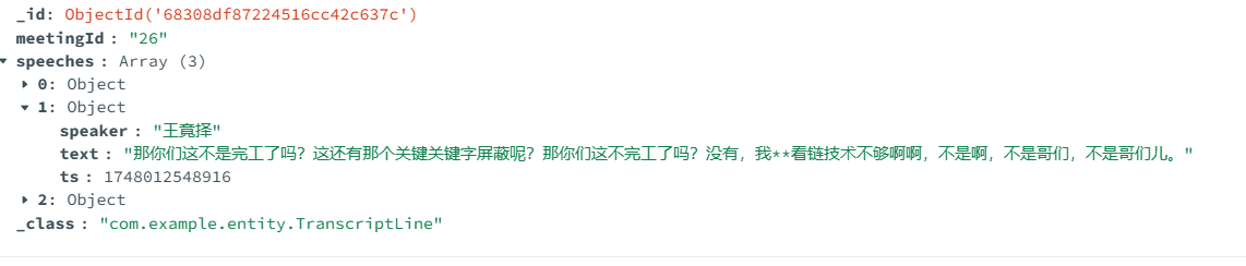 transcript_lines表,字段:id、meeting_id、speaker、text、timestamp。