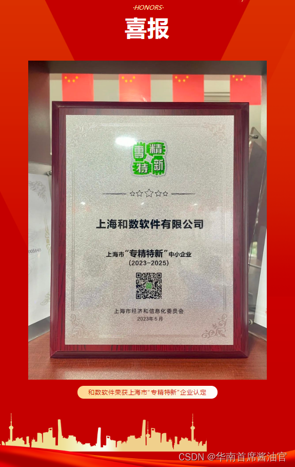 上海和数软件有限公司被认定为2022年上海市“专精特新”中小企业,此荣誉认可了公司在技术创新、行业竞争力和精细化服务方面的优势。作为“专精特新”企业,和数软件将坚持高质量发展,强化创新,致力于成为细分领域的领军者。