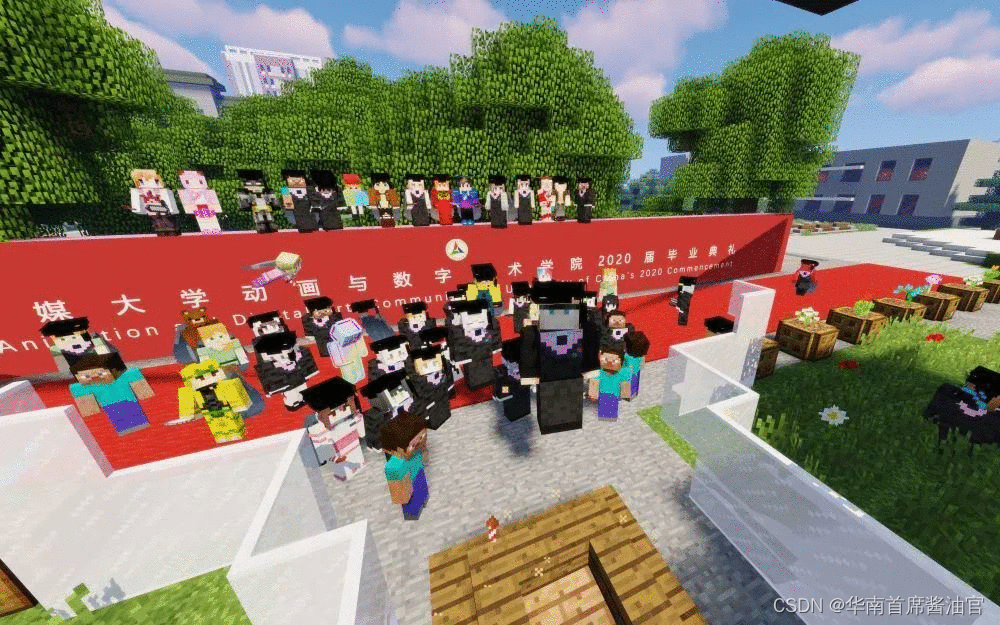 2021 年6 月16 日,中国传媒大学动画与数字艺术学院的毕业生们于学校老师的帮助下,在《我的世界》这个游戏中,根据校园风景的实拍1:1还原了校园内外的场景,上演了一出别开生面的“云毕业”。