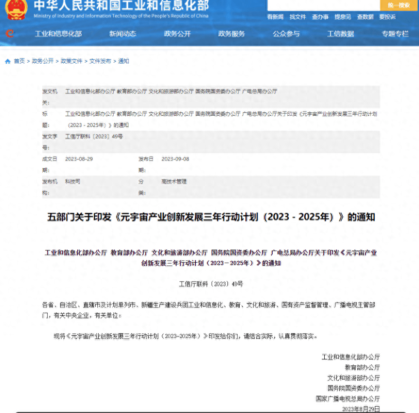 目前,面对元宇宙的兴起,越来越多的企业将目光聚焦于此。9月8日,工业和信息化部、教育部、文化和旅游部、国务院国资委、国家广播电视总局等五部门联合印发《元宇宙产业创新发展三年行动计划(2023—2025年)》(以下简称《行动计划》)。