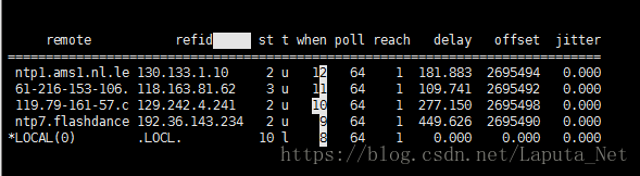 那么大家细心的话就会发现两个问题: 第一我们连接的是0.uk.pool.ntp.org为什么和remote server不一样? 第二那个最前面的+和*都是什么意思呢?