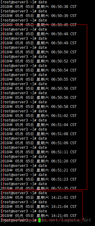 2) 如果服务器时间和上层服务器时间相差不大,ntpd服务器虽然不会停止工作,但是ntpd调整时间的原理是一点点的微调,可能需要同步多次,经历很长时间才能调整过来,如下图所示,中间经过了很长时间的调整,时间才同步过来。而ntpdate是一次性调整到位。基于以上原因,应该先使用ntpdate一次性调整到位,然后再让ntpd工作。