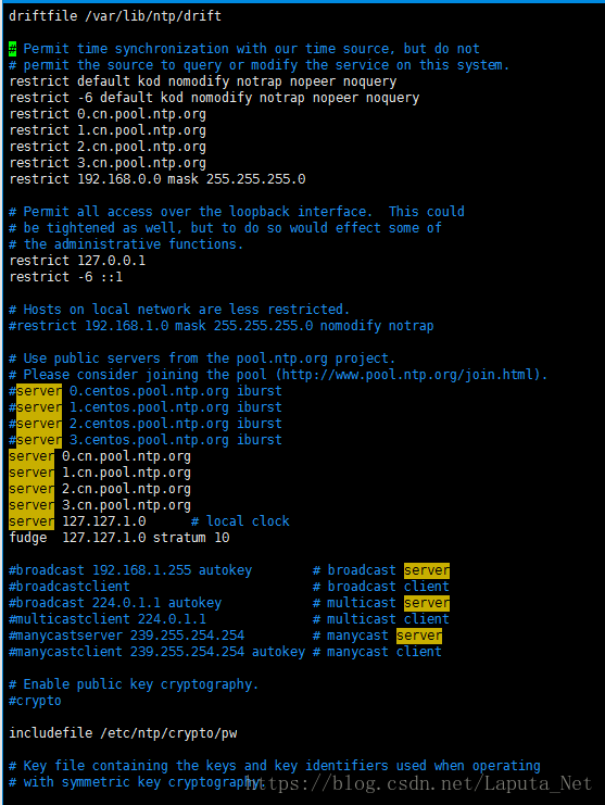 ntpd对下层client来说是service server,对于上层server来说它是client,也就是说新版的NTP服务程序已经不对服务端和客户端进行区分了,统一叫做ntpd。ntpd根据配置文件的参数决定是要为其他服务器提供时钟服务或者是从其他服务器同步时钟。所有的配置都在/etc/ntp.conf文件中。