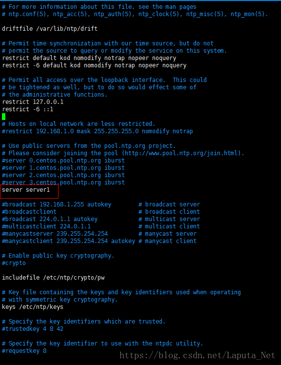 把这三条加入到/etc/ntp.conf中就完成了我们的简单配置. NTP还可以用key来做authentication,这里就不详细介绍了