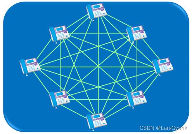 N 部电话机两两直接相连,需 N(N – 1)/2 对 电线。