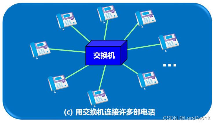 每一部电话都直接连接到交换机上,而交换机使用交换的方法,让电话用户彼此之间可以很方便地通信。所采用的交换方式就是电路交换 (circuit switching)。