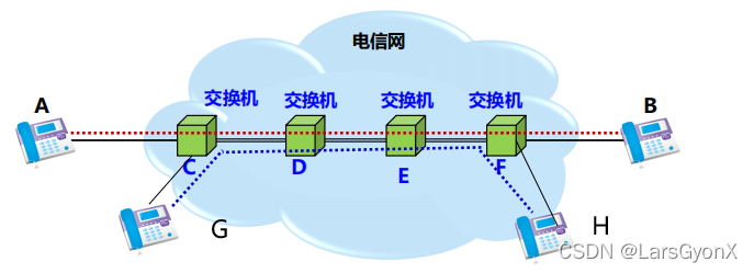在这里,“交换”(switching)的含义就是转接 —— 把一条电话线转接到另一条电话线,使它们连通起来。从通信资源的分配角度来看,“交换”就是按照某种方式动态地分配传输线路的资源。