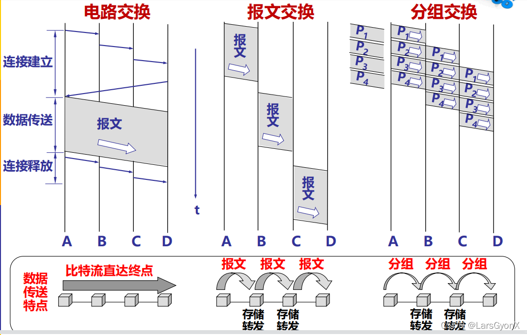 使用场景:需要传输大量数据时,使用电路交换,时延更小。