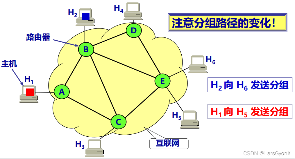 计算机网络数据传输的路径可以动态变化。当H2向H6发送分组时,需经过B结点,这时H1可以走C结点,不一定走B结点。