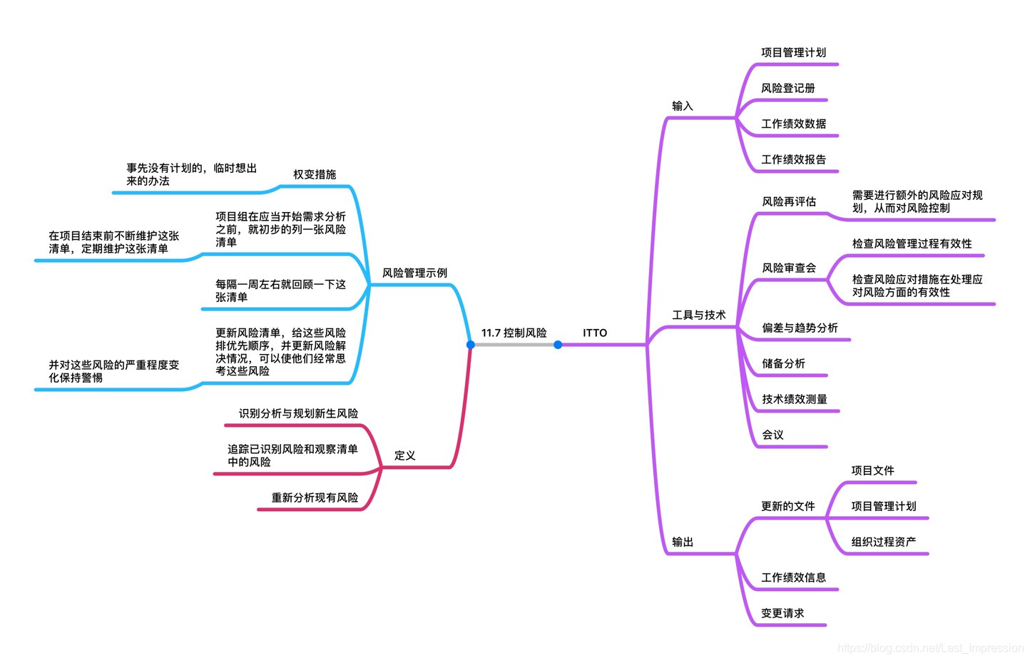 风险控制的定义是重新分析现有的风险,识别与分析规划新生的风险,跟踪已经识别的风险,观察风险清单中的风险;它的输入有风险管理计划,风险登记册,工作绩效数据和工作绩效报告;输出有工作绩效信息和变更请求,更新文件(项目管理计划,项目文件,组织过程资产);控制风险的工具与技术才是重点,包括有:风险再评估,风险审查会,偏差与趋势分析,储备分析,技术绩效测量,会议等,最后是风险管理的一个实例。
