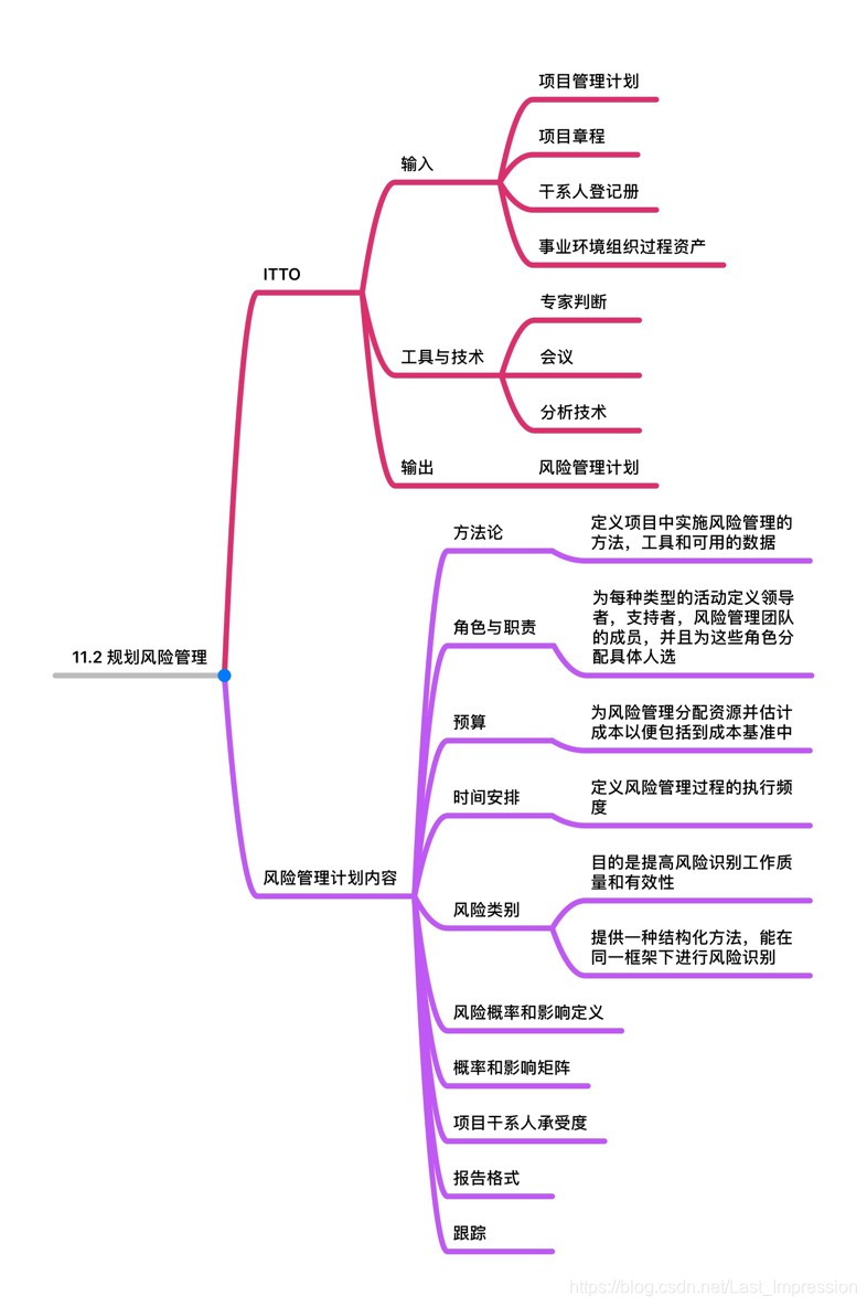 规划风险管理的输入有项目章程,项目管理计划,组过资产和事业环境因素;输出就是风险管理计划,使用到的工具与技术有分析技术,会议,专家判断;风险管理计划的内容有:方法论,角色与职责,预算,时间安排,风险类别,风险概率与影响的定义,概率影响矩阵,干系人对风险的承受能力,报告格式,跟踪。