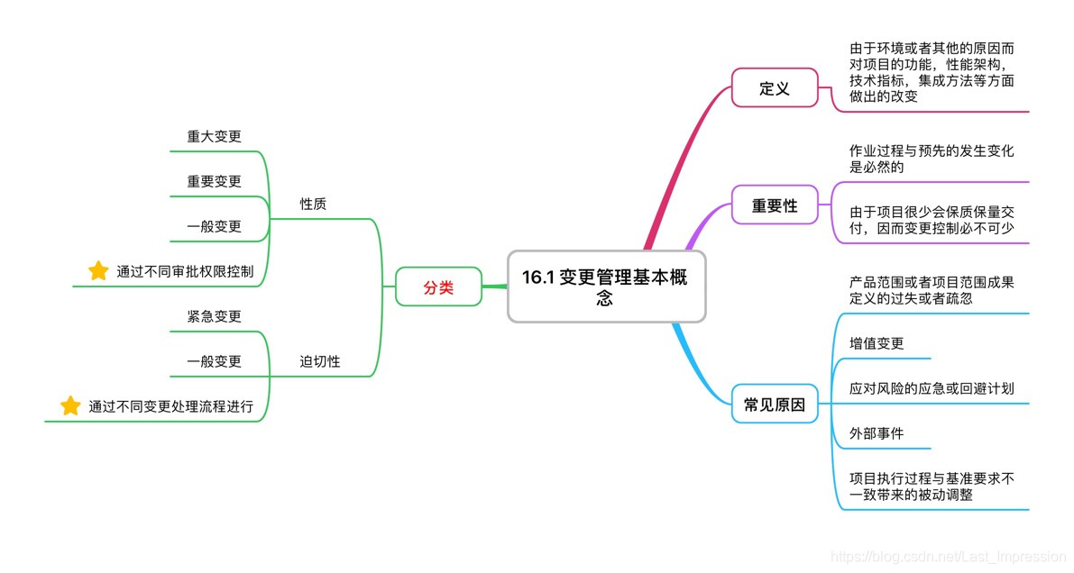 变更管理,按照性质可以分为:重大变更重要变更,一般变更三种,按迫切性可以分为紧急变更和一般变更两种;引起变更的主要原因有五个:外部事件,增值变更,应对风险的应急计划,产品范围或者项目范围定义的过失;项目执行过程中与计划不一致导致的被动调整;由于项目很少会保质保量的完成,因而项目的变更管理变更控制是必不可少的。