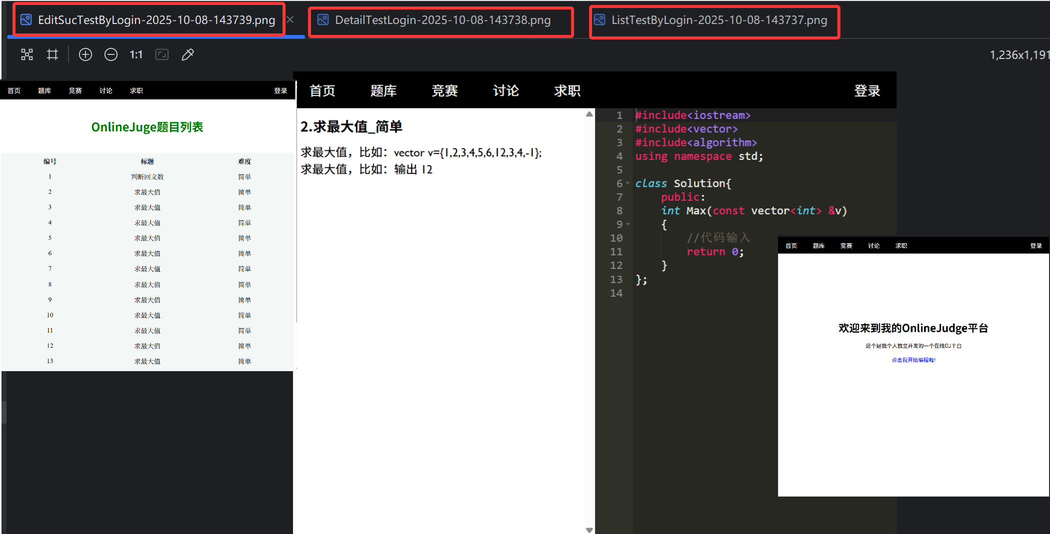 自动化测试之后会生成三组照片,捕获测试用例(因为运行只进行三组),我们从图片就可以观察到OJ首页页面、OJ列表页面、OJ编辑页面