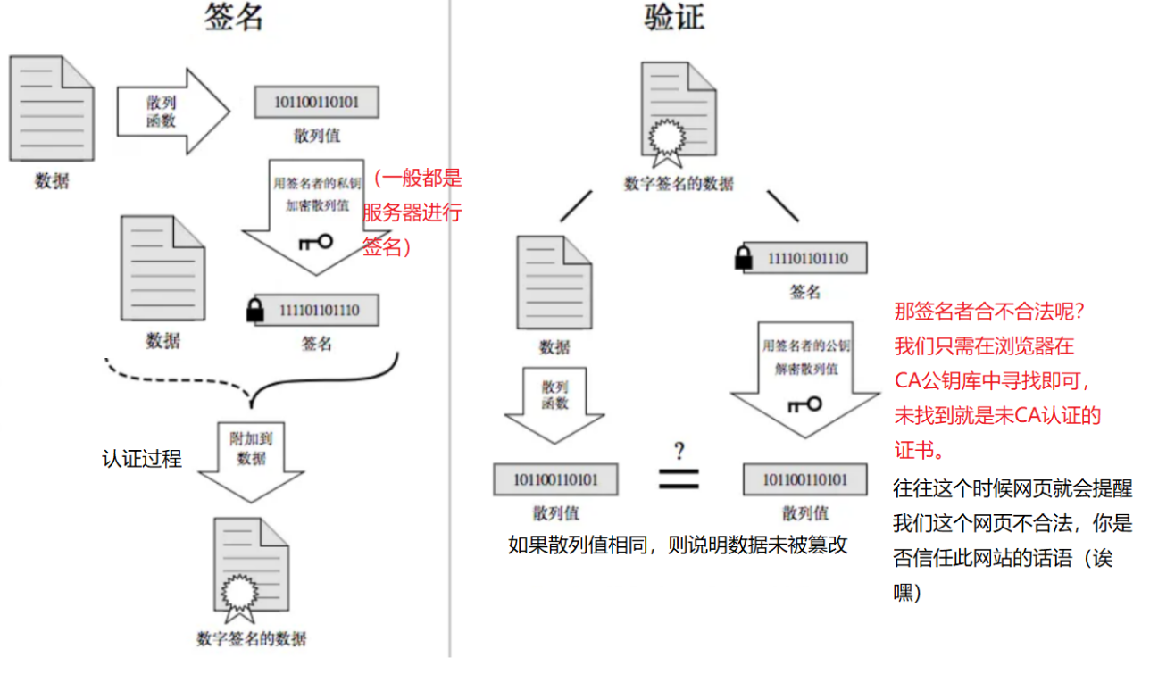 客户端验证时:先使用数据,数据经过散列函数得到一个散列值,数字签名中使用公钥进行解密,解密得到一个散列值,对比这两个散列值是否一致