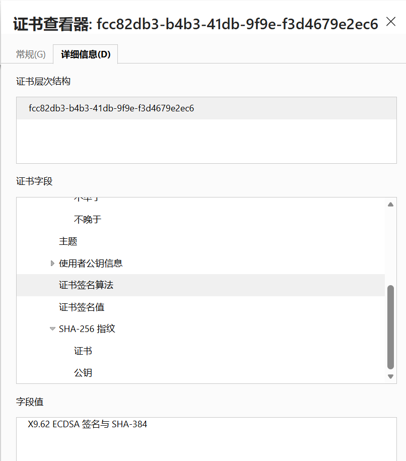 可以看到证书使用了SHA-374hash进行生成数据摘要的