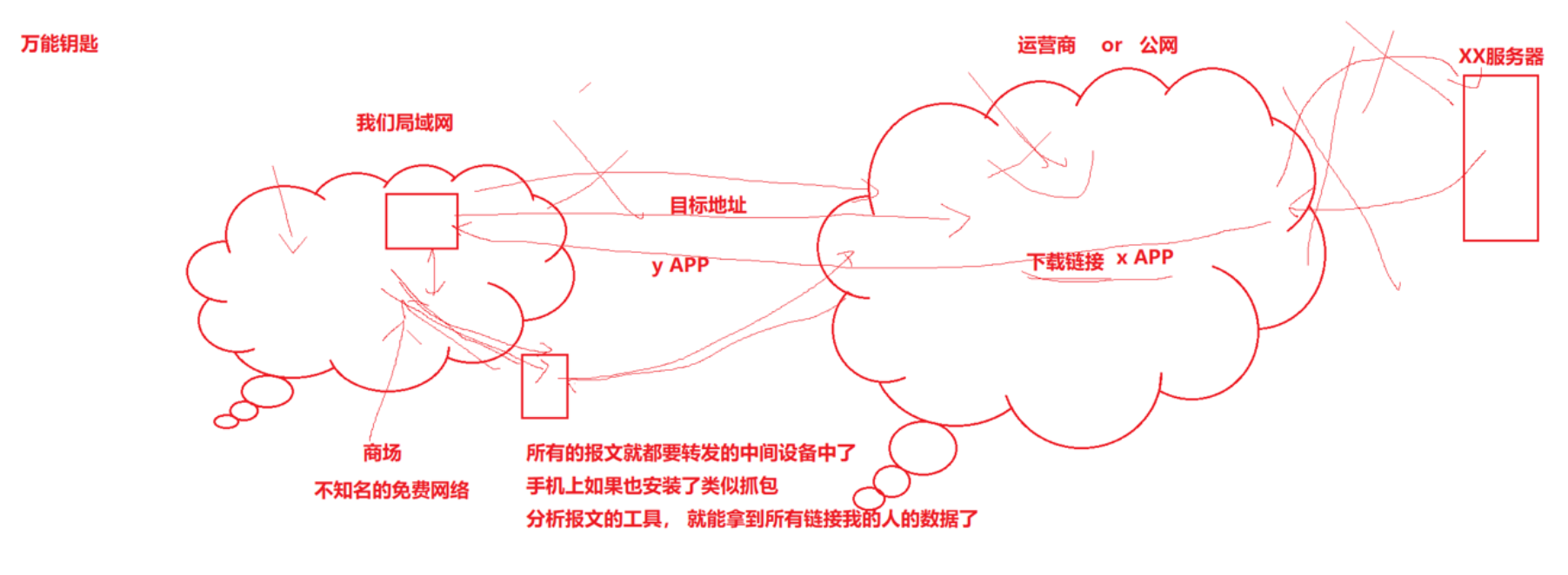 用户手机 / 电脑连接了这个免费 WiFi,并用它访问目标地址(比如 XX 服务器)、下载 APP(图里的 “y APP”)。