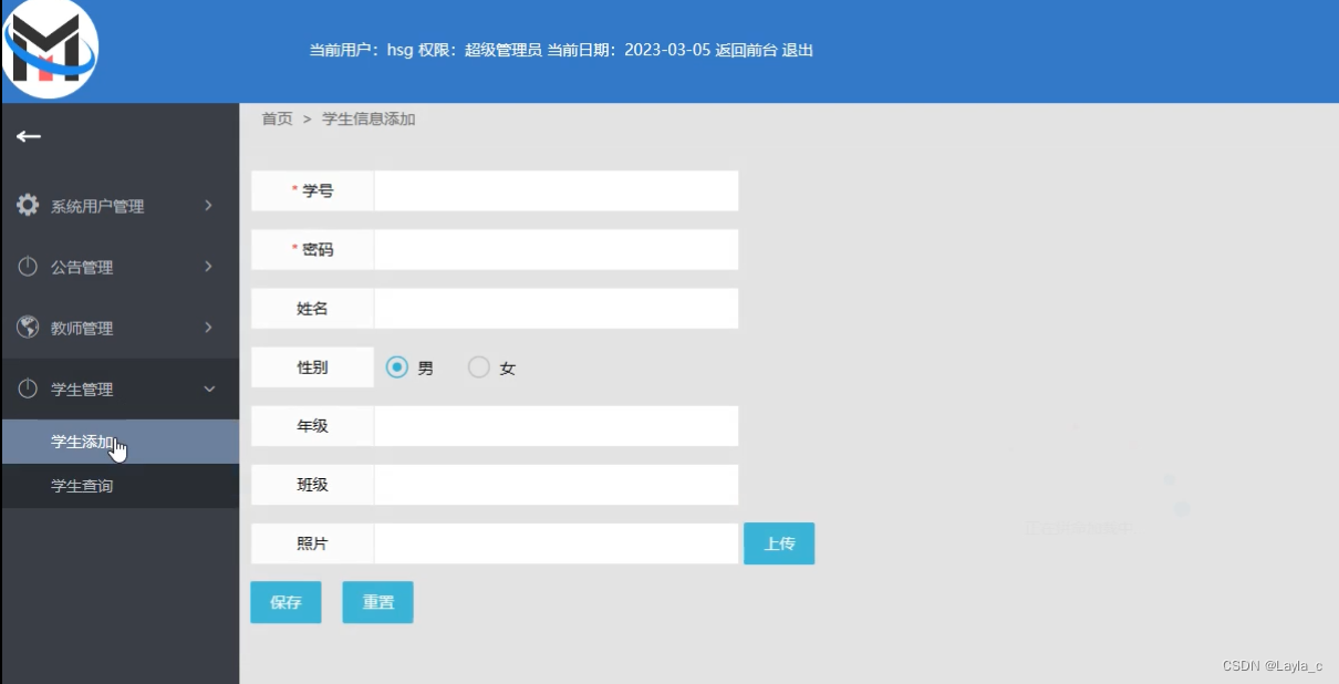 通过学生管理模块可以实现小学学生信息的添加,内容包括了登录在线测试系统平台所需要的学号及密码信息,同时还包括学生的姓名性别,所在年级班级以及照片信息,通过学生基础信息的录入可以帮助实现在线测试系统的登录以及测试阶段的信息录入应用,具体学生信息内容如下:
