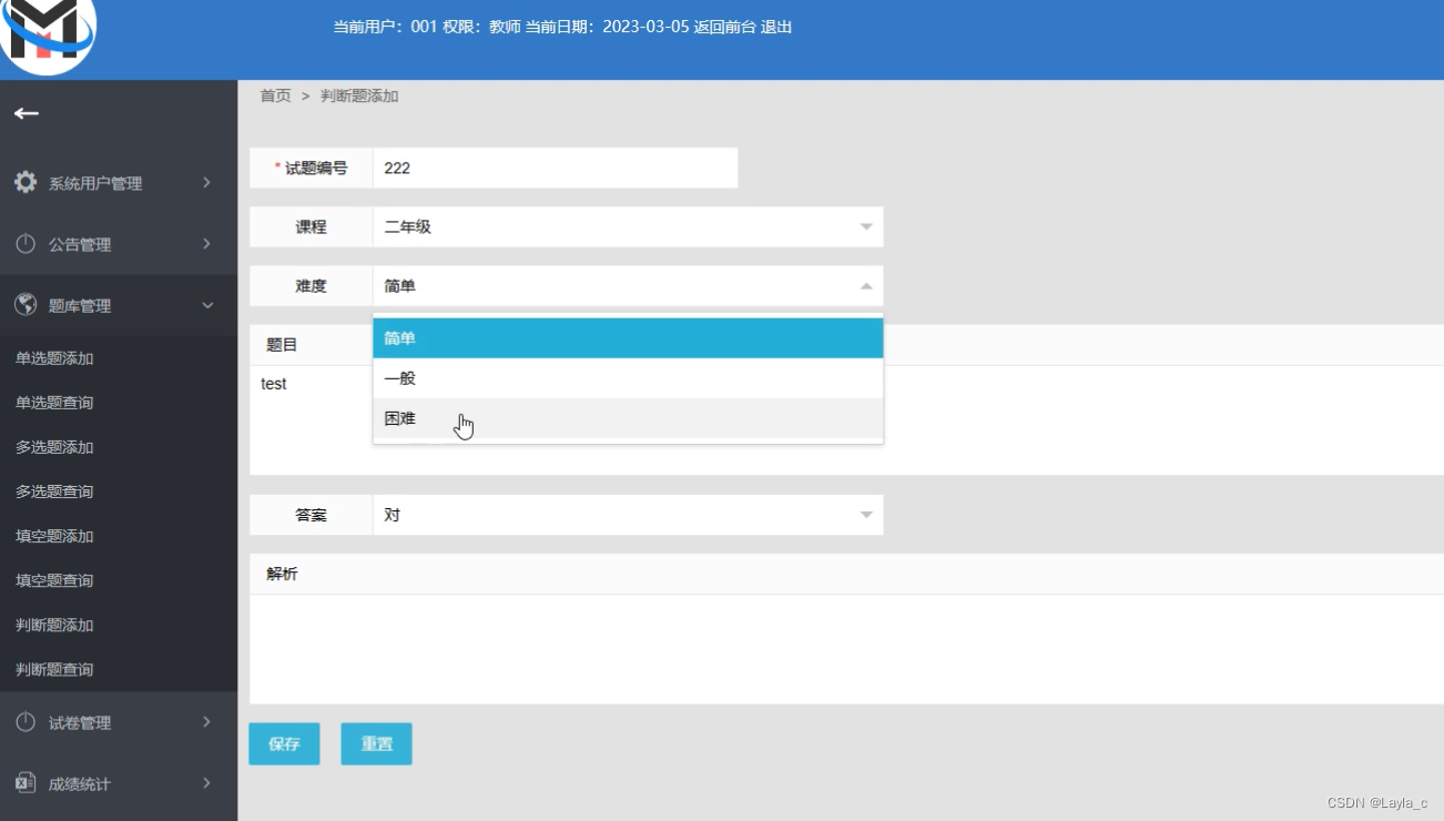 教师可以根据测试的需求添加不同的试题内容,通过判断题添加界面可以对课程内容、题目难度及题目信息进行在线添加,同时可以通过答案的删选来实现题目信息的完整填入,具体判断题添加界面信息内容如下:
