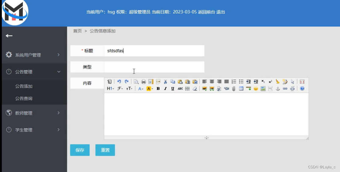 管理员用户借助系统后台的公告管理界面可以实现校园内公告信息的添加和查询,公告信息的内容主要包括了公告的标题及发布内容的类型,通过正文内容信息的录入实现公告信息的添加。同时教师和学生用户可以通过个人后台查看到管理员发布的公告内容,具体公告信息添加界面内容呈现如下: