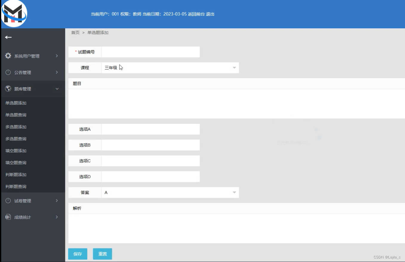 教师用户可以通过管理员用户提供的教师工号及密码信息实现小学数学在线测试系统平台的登录,结合小学数学的课程内容实现不同类型测试题目的添加,包括单选题、多选题、填空题及判断题,题库管理模块可以实现题目信息以及答案的录入,同时对于题目进行解析信息的录入。结合题库管理的内容可以通过试卷管理模块实现在线的随机测试试卷的生成,同时可以借助成绩统计模块查询到不同学生的历史成绩成长轨迹,以及试卷低分试题的统计,具体教师用户功能模块内容呈现如下: