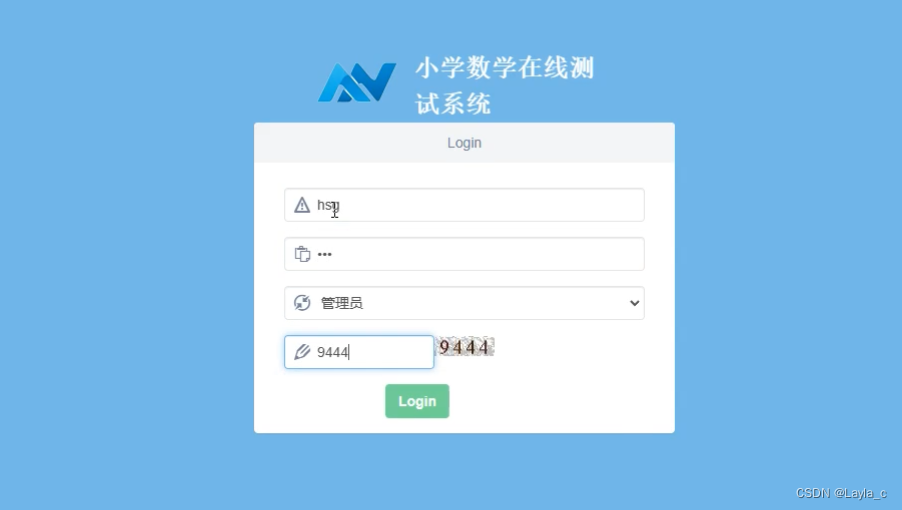 小学数学在线测试系统的登录界面按照系统用户角色划分,可以通过教师、学生用户及管理员的角色权限筛选实现系统平台的登录,对应的用户角色需要录入正确的用户名及密码信息,同时还需要录入动态验证码才可以实现在线测试系统的登录和使用,具体系统登录界面内容呈现如下: