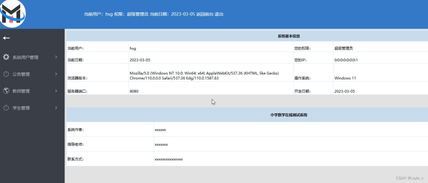 管理员用户登录进入在线测试系统后台可以实现教师及学生信息的管理,借助系统后后台的教师管理及学生管理模块实现相关用户信息的添加,同时还可以通过公告管理界面实现考试通知及校园公告内容的发布,小学数学在线测试系统的管理员后台功能模块内容相对简单,主要以用户信息管理为主,具体功能模块内容呈现如下: