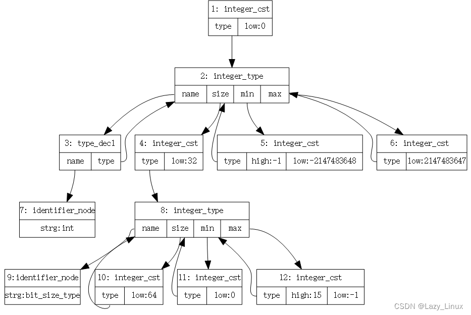 可以看出,该词法符号所创建的树节点为一个标识符节点(其TREE_CODE为IDENTIFIER_NODE),其描述的字符串为"int"。