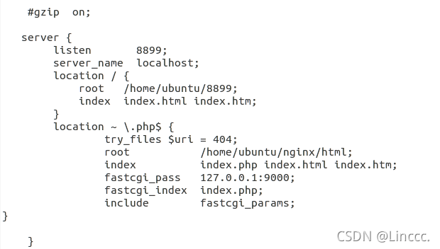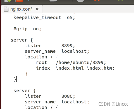 1、请仿造“Web服务器”中第四点,监听8080端口的例子,创建一个server,并让该服务监听8899端口(配置完记得重启nginx:/home/ubuntu/nginx/sbin/nginx -s reload)
