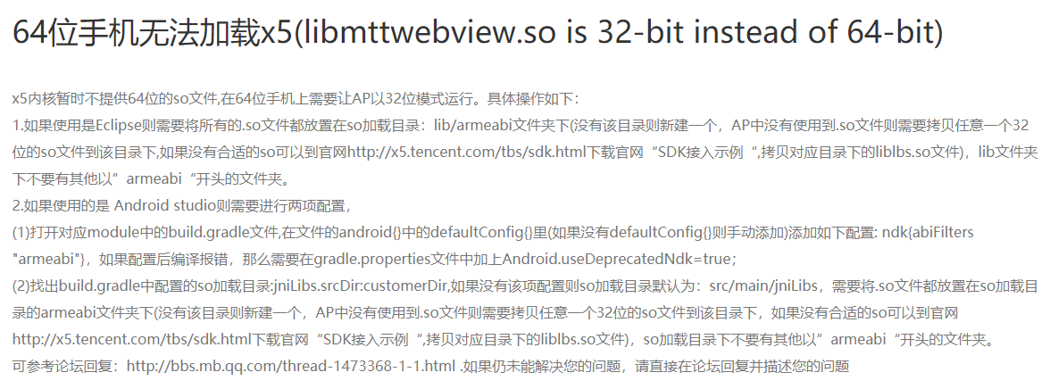 (1) X5暂时不提供64位so文件,为了保证64位手机能正常加载X5内核,参考如下: