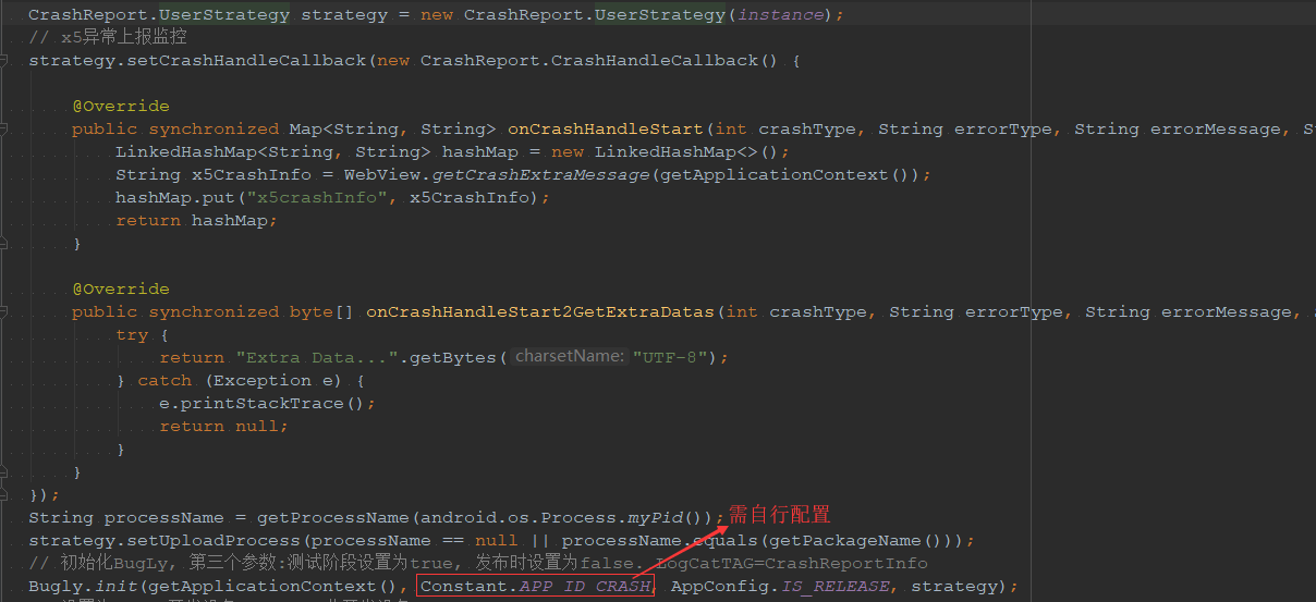 (2) 该Service仅在TBS内核首次Dex加载时触发并执行dex2oat任务, 任务完成后自动结束 android:process=":dexopt" /> (3) 新建APP类继承于Application,不要忘记了在清单文件中配置; // 在调用TBS初始化、创建WebView之前进行如下配置,以开启优化方案(仅Android 5.1+生效) QbSdk.setDownloadWithoutWifi(true); 若配置了bugly sdk的异常捕获的话,则可以引入以下代码捕获异常上报的功能,此处未配置,需自行引入,防止找不到相关类 配置如下图: