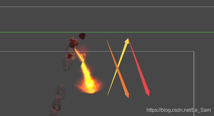 3.计算简易过程,黄色为子弹方向向量,计算出与墙的夹角,根据入射角等于反射角算出橙色方向向量。此时只是子弹方向改变了,接下来还要算出位置的偏移量,根据与墙夹角与子弹本身的大小由三角函数sin/cos算出偏移量,最终效果如红色箭头。