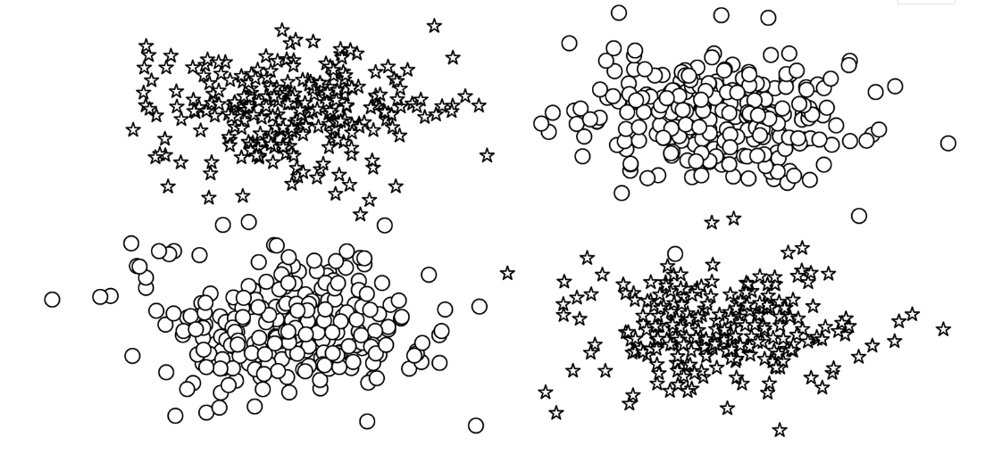虽然在图中显示MLP有两个决策边界,这是它的优点,但它实际上只是一个决策边界!决策边界就是这样出现的,因为中间表示法改变了空间,使一个超平面同时出现在这两个位置上。在图4-4中,我们可以看到MLP计算的中间值。这些点的形状表示类(星形或圆形)。我们所看到的是,神经网络(本例中为MLP)已经学会了“扭曲”数据所处的空间,以便在数据通过最后一层时,用一线来分割它们。